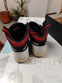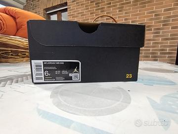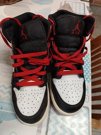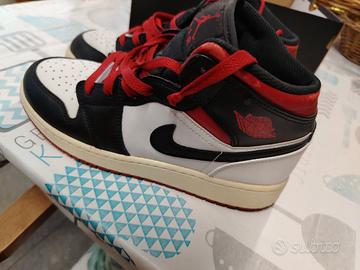 Vendo un paio di Air Jordan 1 Mid nella colorazione classica "Chicago-style" (Bianco, Nero e Rosso Gym). Il modello è la versione Grade School (GS), perfetta per ragazzi o per chi porta il numero 38.5. Le scarpe sono originali al 100%, complete di scatola originale visibile in foto. le condizioni della scarpa é buana, presenta un po di giallo sulla suola e nella punta della scarpa é un po' piegato.