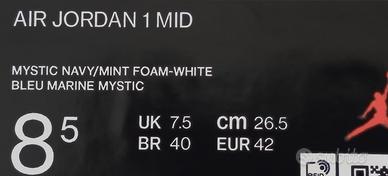 Vendo bellissime Air Jordan 1 Mid nella splendida colorazione Mystic Navy/Mint Foam (SKU: 554724-413). Una combo cromatica incredibile che unisce l'eleganza del blu navy alla freschezza del menta, perfetta per distinguersi con stile.