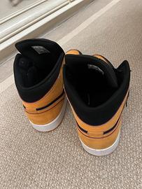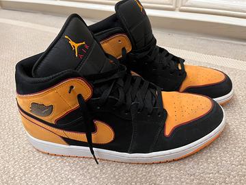 Modello: Air Jordan 1 Mid Colorazione: University Gold / Black / Gym Red (Dettagli gialli e neri con bordi rossi a contrasto). Taglia: 48.5 EU / 14 US / 13 UK (32 cm). Condizioni: Ottime condizioni / Indossate poche volte