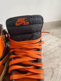 Vendo Air Jordan 1 Retro High OG “Shattered Backboard 3.0”, colore arancione/nero con dettagli in vernice lucida.