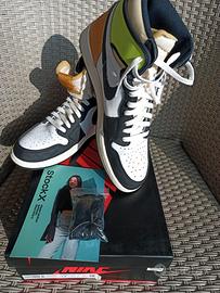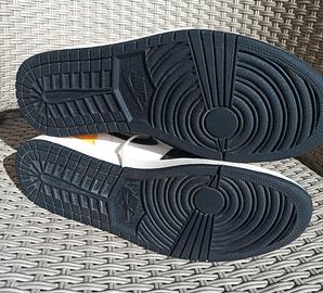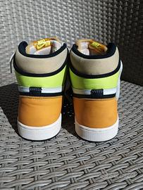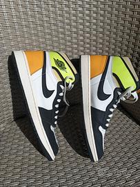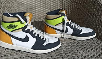Vendo Air Jordan 1 Retro High bianco nero giallo oro universitario originali acquistate su StockX usate pocchissimo. Stato delle scarpe perfetto. Misura US12 (EU46). L'Air Jordan 1 Retro High OG "Volt Gold" offre al famoso modello un leggero restyling ispirato ai precedenti colori di Air Jordan 1. Un'etichetta trasparente invertita su una linguetta in schiuma a vista e lembi del colletto rimovibili in un accattivante colore Volt sono due caratteristiche distintive. Il resto della parte superiore in pelle è realizzato in color blocking tritonale, con una base bianca pulita, sovrapposizioni nere a contrasto nell'avampiede e un pannello del tallone University Gold.