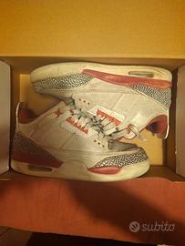 Vendo Air Jordan 3 vintage in colore bianco/arancione con dettagli “elephant print”. Scarpe originali, usate e con segni di usura visibili sulla tomaia e sulla suola, ma ancora indossabili. Ideali per chi cerca un paio economico per collezione, restauro o uso quotidiano.
