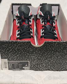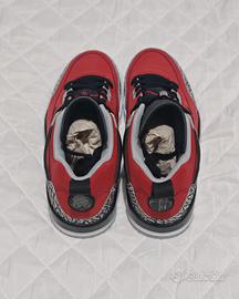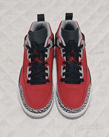Vendo queste sneakers Jordan Spizike nuove, mai indossate. Colore dominante rosso con dettagli in nero, grigio e iconico motivo "cement" sulla punta e sul tallone. Perfette per gli amanti dello stile streetwear e collezionisti Jordan.