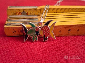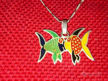 Bellissima catenina firmata AIROLDI in argento 925 come da punzone e timbro con ciondolo UNOAERRE (mod.dep.) PESCIOLINI smaltati (vari colori) CHE SI BACIANO sempre in argento 925 come da punzone e timbro argentiere. La catenina è lunga circa 42 cm ed il ciondolo è largo circa 3.5 cm. Gioiello unico. Vintage originale anni 70.