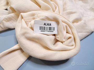 L'eleganza minimalista incontra la maestria senza tempo in questo bodysuit con collo alto Alaïa. Realizzato con cura in Italia in lana fine di alta qualità, offre una sensazione calda ma leggera sulla pelle. Il collo alto e le maniche lunghe creano una silhouette raffinata, mentre la vestibilità aderente avvolge il corpo, creando un effetto seconda pelle. Il design prosegue sul retro con una finitura pulita e scolpita che evidenzia la precisione sartoriale distintiva di Alaïa. La base a forma di tanga consente un layering fluido sotto i vestiti, mentre i pratici bottoni a pressione offrono comfort e funzionalità. Il delicato punto di coste al colletto e ai polsini aggiunge un tocco di texture, arricchendo questo capo essenziale per il giorno e la sera. Un fondamento versatile per un guardaroba capsule, questo bodysuit avorio incarna la sofisticatezza parigina e la sensualità moderna di Alaïa.