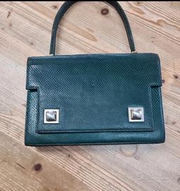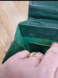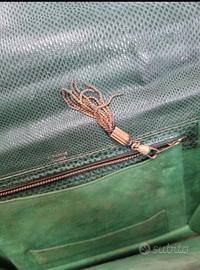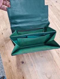 Rara borsa albanese milano anni cinquanta, condizioni buone come da foto, il rettile verde bottiglia, particolare chiusura frontale, corredata di porta spicci chiusura interna e scomparti unico difetto è leggermente scucito uno scomparto mis 24x17 cm soffietto min2,5 cm max 10