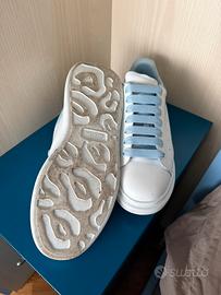 Vendo bellissime sneaker Alexander McQueen Oversized originali in una colorazione fresca ed estiva: pelle bianca con dettaglio sul tallone in azzurro pastello lucido e lacci larghi coordinati.