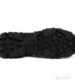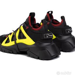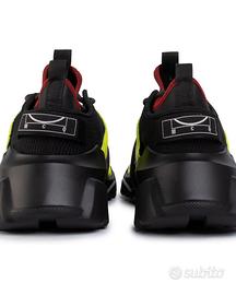 McQ Alexander McQueen Orbyt Mid in una combinazione di colori nero e giallo neon. Caratteristiche principali Design: Sneaker mid-top realizzata con materiali misti, caratterizzata da un vistoso inserto geometrico giallo neon su base nera. Materiali: Realizzata con una combinazione di pelle di vitello, camoscio e neoprene elasticizzato per una calzata flessibile e confortevole. Dettagli: Lacci in stile trekking, linguetta posteriore e suola spessa in gomma scanalata. Marchio: Logo “ORBYT” sulla linguetta.
