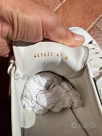 Sneakers Originali 2023 con lacci in pelle bianca liscia con punta arrotondata, bianchi, tallone nero con Logo, linguetta e suola con logo, tg. 41-42, (27,3 cm. USA) lacci piatti, perfetto stato usate 3 volte, attualmente costano 500€.