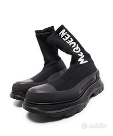 Stivaletto Alexander McQueen Tread Slick, modello a calzino. Parte della collezione Autunno/Inverno 2022 del marchio, questo modello reinterpreta l'iconica silhouette Tread in una moderna forma a stivale. Caratteristiche principali Tomaia: Realizzata in poliammide a coste nere con logo "McQueen" intarsiato sul lato. Suola: Caratterizzata da una suola in gomma spessa e oversize con battistrada antiscivolo e logo in rilievo. Costruzione: Presenta punta arrotondata e caviglia a calzino per una calzata facile da indossare. Prodotto in Italia.