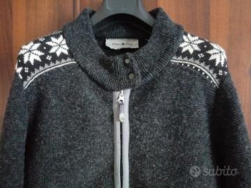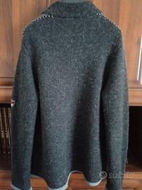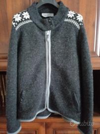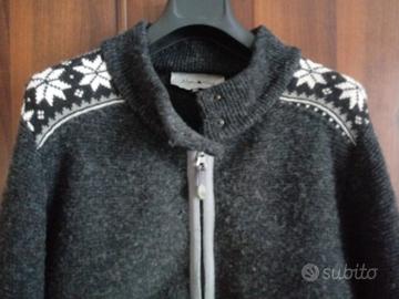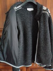 Il capo è pulito e in condizioni perfette, pari al nuovo. Presenta un disegno "nordico" bianco sulle spalle, il particolare colletto rotondo è chiuso da due bottoni automatici mentre sul davanti compare una zip. Tutti i bordi sono contraddistinti da una fascetta grigio perla. La giacca è completamente foderata sul davanti e all'interno delle due tasche, il dietro è leggermente più lungo del davanti.
