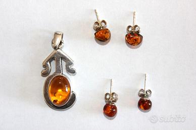 due paia di orecchini in argento e ambra, un paio tondeggianti (6 mm), un paio esagonali (7mm), pendente con ambra su argento 925 (4 x 1,5 cm).