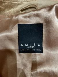 Giacca biker/crop Amisu Leather in vera pelle scamosciata (suede) 100%, colore beige/taupe camel.Modello premium: collo standing, zip asimmetrica frontale, zip multiple su tasche/maniche, fibbie regolabili fianchi, fit cropped slim con spalle strutturate, fodera raso beige 100% poliestere, dettagli perforati traspiranti.Ottimo stato/nuovo, mai o pochissimo indossato, etichette intatte, fodera perfetta, nessun segno evidente.Taglia US/XL (EUR 44–48 / IT 44–48 / D/E/F 44) – fit slim/cropped, lunghezza corta sopra fianchi.Ideale per look rock-chic, urban, primavera/autunno o moto-inspired.Qualità vera pelle scamosciata, brand spagnolo premium