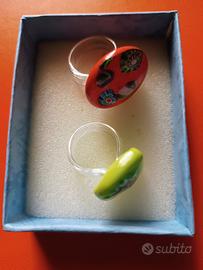 Vendo due nelli artigianali in vetro con murrine multicolore sommerse, che creano un bellissimo effetto di profondità. Uno su base rossa e l'altro su base verde.