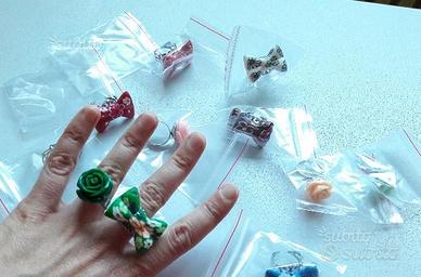 Anelli realizzati a mano in pasta polimerica Fimo o resina, con basi metalliche regolabili.