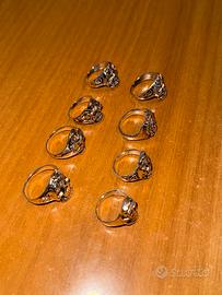 Vendo set di 8 anelli teschio in acciaio colore argento, varie misure da 16mm a 19 mm. A disposizione per ulteriori foto o dettagli della misura desiderata. Ottime condizioni. Adatti per dito mignolo.