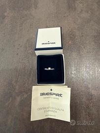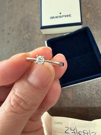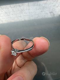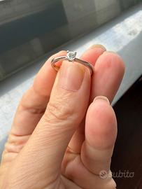 Anello solitario oro bianco 18kt con diamante 0.14 ct – originale con certificato e garanzia attiva. Elegante anello solitario in oro bianco 18kt (750) con diamante naturale taglio brillante da 0,14 carati. Misura 17 mm Il diamante presenta colore GH e purezza SI, caratteristiche che garantiscono una buona luminosità e brillantezza. L’anello è completo di scatola originale e certificato, messo solo un mese. Misura: 14 (IT)Condizioni: ottime, normalissimi lievi segni di utilizzo sulla parte posteriore Diamante naturale 0,14 ct Oro bianco 18kt (750) Taglio brillante Completo di confezione e certificato e garanzia