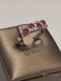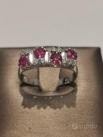 6) Anello in oro bianco 18 KT (750/1000), con rubini naturali di 0,80 carati circa, e diamanti naturali taglio huit-huit di caratura totale di circa 0,06 punti.