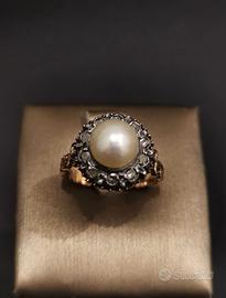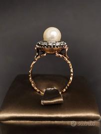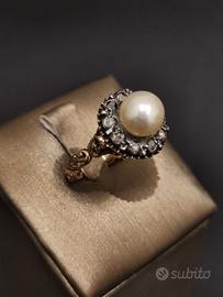 8) Anello vintage con montatura in oro 14kt e parte superiore in argento, con perla e diamanti taglio rosetta.