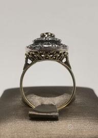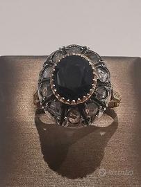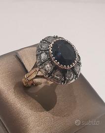 7) Anello con montatura in oro giallo 18 KT e parte superiore in argento 800, con zaffiro naturale di circa 2,20 carati e diamanti taglio rosetta di circa 0,60 carati.