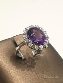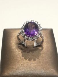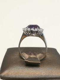 3) Anello in oro bianco 18 KT (750/1000), con ametista centrale naturale taglio ovale, di 3,80 carati circa, contornata da diamanti naturali taglio huit-huit di caratura totale di circa 0,10 punti, colore F/G, purezza VS1/VS2.