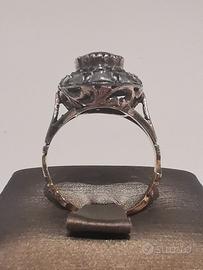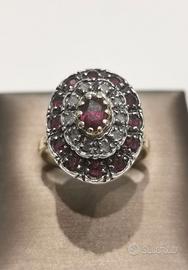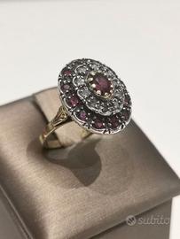 2) Anello con montatura in oro 18 KT (750/1000) e parte superiore in argento, con rubini e diamanti taglio rosetta.