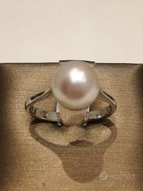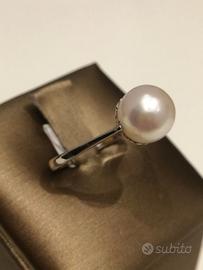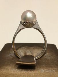 5) Anello in oro bianco 18 KT (750/1000), con perla giapponese di acqua salata di diametro 8,5-9 mm.