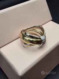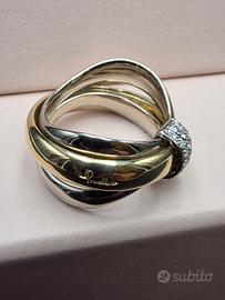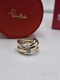 Bellissimo anello di Pomellato in oro giallo e bianco 18 carati a tre fasce intrecciate collegate tra loro da un elemento rettangolare con pavé di diamanti naturali taglio brillante.