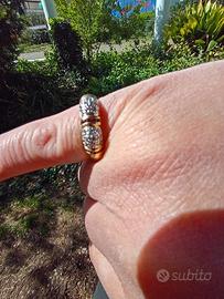 Splendido anello a fascia bombata realizzato in oro giallo (punzone presente all'interno del gambo), arricchito da una preziosa lavorazione artigianale. L'anello presenta tre sezioni principali con pavé di brillanti/diamanti bianchi, intervallate da rubini di un rosso intenso che creano un contrasto elegante e senza tempo. Un gioiello importante, perfetto per un regalo speciale o per chi ama gli accessori di classe. Dettagli dell'oggetto: Materiale: Oro Giallo (punzonato). Pietre: Diamanti/Brillanti e Rubini naturali. Peso complessivo: circa 7-8 grammi (come da foto su bilancia di precisione). Design: Fascia larga bombata, molto confortevole al dito. Condizioni: Ottime, l'oro conserva la sua lucentezza e le pietre sono saldamente incastonate.