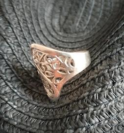 Realizzato in argento 925, a fascia larga con lavorazione caratterizzata da un raffinato designtraforatocon motivi afiligrana, spirali e foglie.