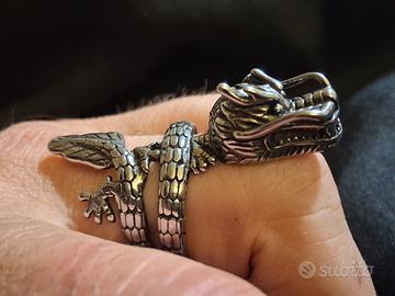 anello in acciaio con dragone finitura argento anticato