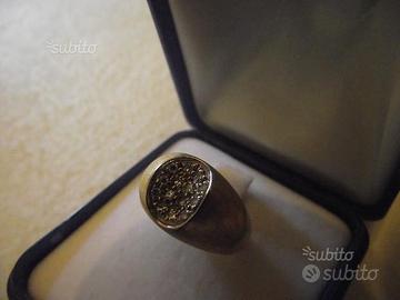 l' anello di ottima ed ormai introvabile fattura orafa presenta una lavorazione in oro satinato con un castone ovale incavo ove sono posizionati 14 brillantini di bella luce per un totale di circa 15 punti di carato.