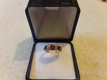 L' anello di antica fattura ottocentesca presenta su un meraviglioso castone in oro antico un rubino di bella qualità di circa 30 punti di carato contornato da quattro diamanti (taglio antico) per un totale di circa otto punti di carato e ai lati presenta due zaffiri di ottima qualità per un totale di 30 punti di carato .
