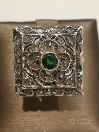 Anello antico con montatura in oro 14kt e parte superiore in argento, con smeraldo centrale taglio rotondo e contorno di diamanti taglio rosetta.