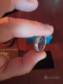 Anello originale da collezione in Argento925 della saga "Il Signore degli Anelli". Completo del suo sacchetto in pelle, del cofanetto in legno e pelle e dell'involucro in cartone rigido, come si vede in foto. Acquistati dalla linea di Acacia Giuseppe medioevo New Line Cinema