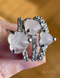 Elegante anello in argento con tre cuori di quarzo rosa al centro, circondati da zirconi scintillanti.