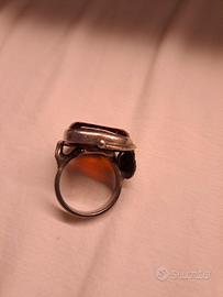 Elegante anello in argento con una pietra d'ambra incastonata. L'ambra presenta inclusioni naturali che le conferiscono un aspetto unico.