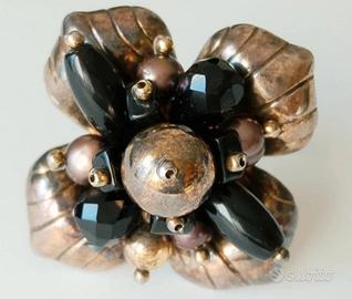 Meraviglioso anello in argento 925 grande con fiore centrale impreziosito da perle e sfere di onice🖤