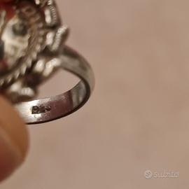 È un regalo di mia zia acquistato anni fa in Indonesia mi ha spiegato che quando lo ha acquistato le hanno detta che la pietra centrale è una corniola. È fatto artigianalmente pertanto eventuali asimmetrie o irregolarità non sono da considerarsi un difetto ma dimostrano che è fatto artigianalmente come l'asimmetria sull anello e una lineetta che ho evidenziato con un segno giallo in foto. Indossato poche volte.