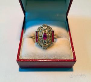 Splendido anello di bigiotteria in rame placcato oro in stile Art Déco con zirconi sintetici bianchi e rosso rubino