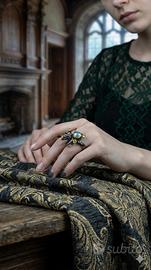 Splendido anello in Argento 925 con finitura Black Rhodium & Gold. Un gioiello materico e magnetico che unisce il mistero della Labradorite africana (8 \times 6 mm) alla luce dei Peridoti del Pakistan.