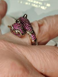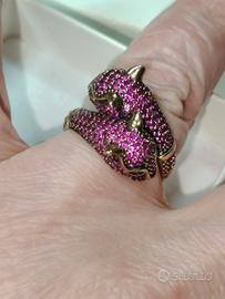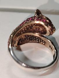 Spettacolare anello pantere in argento 925 con radici di rubino e due zirconi bianchi al posto degli occhi