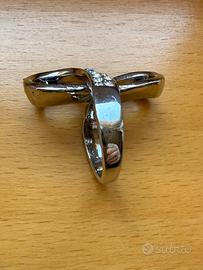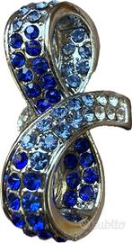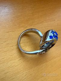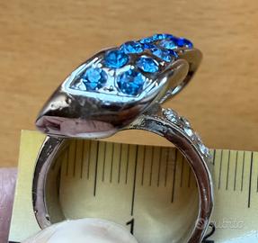 Anello di bigiotteria con un design a fiocco, impreziosito da pietre colorate, incastonato con pietre trasparenti bianche, celesti e blu. Montatura in metallo argentato. Circa 18 mm di diametro