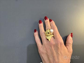 Anello in argento bagnato in oro con perla fresh water e occhi con ametista cabuchon, realizzato con tecnica a cera persa. Mai indossato, misura regolabile.