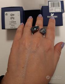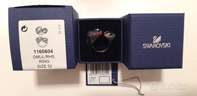 Cocktail ring dallo stile moderno, formato da 2 cristalli ciano più grandi posti alle estremità, tempestati alla base da piccoli cristalli color magenta, montatura rodiata, taglia 52, originale Swarovski, in perfette condizioni, completo di scatolina con etichetta identificativa e cartellino.
