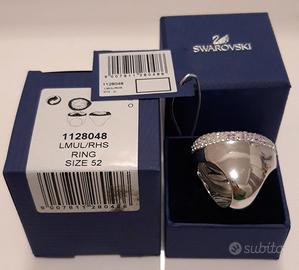 Opulento cocktail ring originale Swarovski con grande cristallo incolore circondato da una miriade di piccoli cristalli rosa e azzurro tenue, incolore e bianco opalescente, incastonati con tecnica pointiage su montatura rodiata, taglia 52. Completo di scatola con etichetta identificativa, tag con codice e certificato di autenticità.
