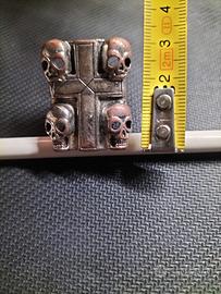 Anello in metallo vissuto, che conferisce un aspetto di più colori, con croce e teschi, prevalentemente da uomo. diametro anello circa cm.2,3