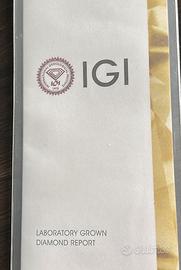 Il diamante centrale è di laboratorio, taglio Princess da 2.08 carati, certificato IGI, grado E e purezza VS1, incastonato su un anello in oro bianco 750.