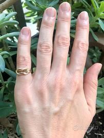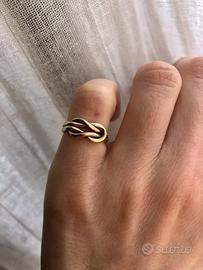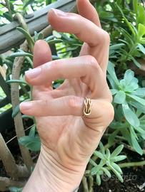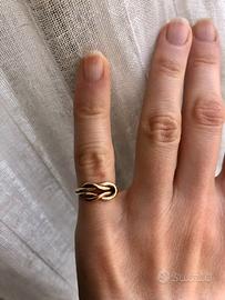 Anello con doppio nodo marinaro, simbolo d'amore o d'amicizia, in oro giallo e oro rosa 10 carati che si intrecciano. Perfetto da regalare a chi amiamo (anche noi stessi :) La misura è 5, circonferenza interna circa 15 millimetri. Peso 3 grammi.