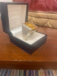 Anello in arg 925 con topazio giallo di 8/9 carati ( non ricordo perfettamente ma e’ una pietra veramente grande),gioiello bellissimo come si vede dalle foto,la pietra e’ tagliata perfettamente e il modello è semplice e la sua semplicità lo rende unico,ho cercato per quanto possibile di fotografare anche il punzone dell’argento.